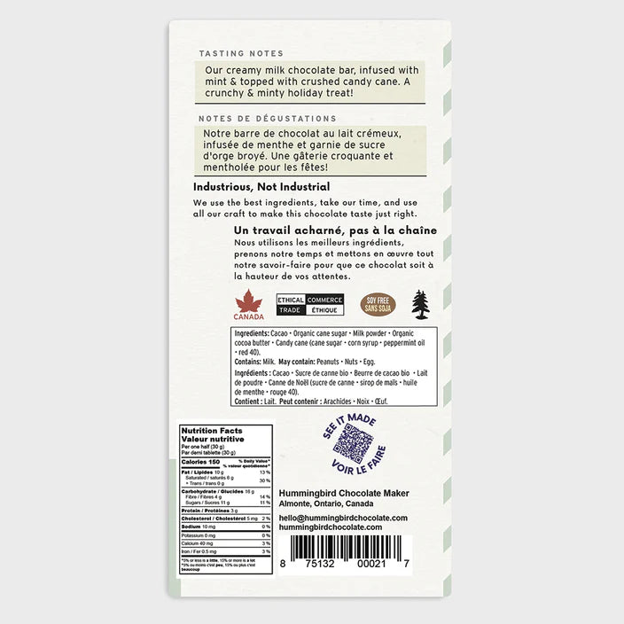 About Hummingbird Chocolate (Ontario): From careful sourcing of quality cacao beans to a deep commitment to the farmers who cultivate the beans, we have great respect for people who make food, from grower to artisan. With much care, we handcraft chocolate from our small workshop in beautiful Almonte, Ontario. Our chocolate is carefully made to bring the perfect balance of flavour, and we hope you can taste it in every bite. Hummingbird Chocolate is ethically traded.