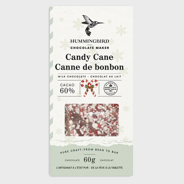 Our creamy 60% milk chocolate topped generously with candy cane pieces. Perfect stock stuffer for the young and young at heart.