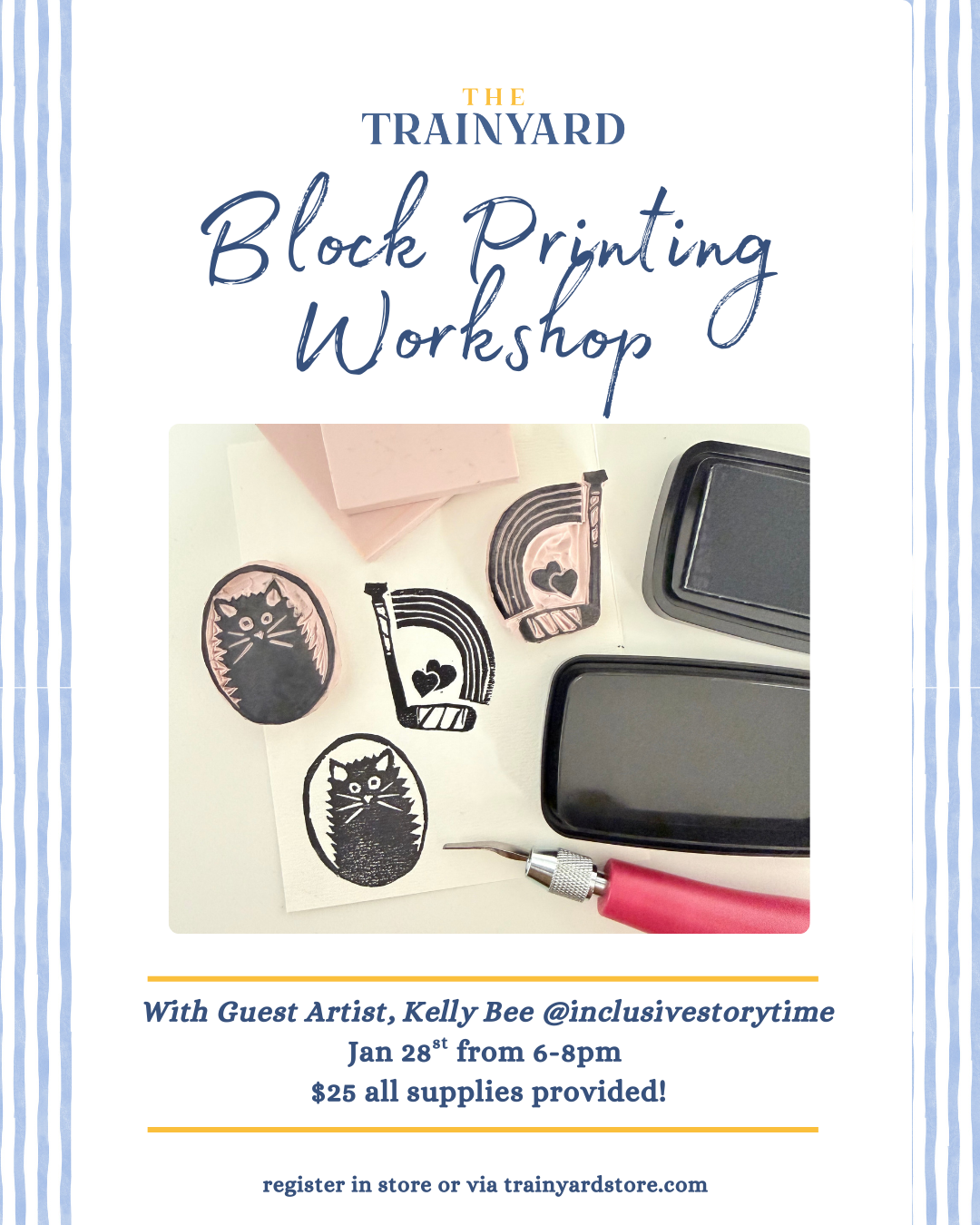 Learn block printing basics and carve 2-3 of your own pvc block printing stamps to take home! Participants can bring their own simplified 1.5” square drawings or choose from one of the designs pictured. This beginner friendly workshop will be led by local artist, Kelly Bee of @inclusivestorytime