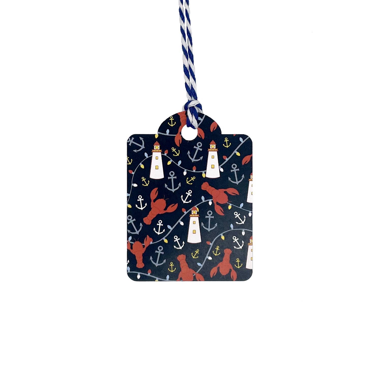 Add a nod to the nautical with these gift tags patterned with lobsters, lighthouses and Christmas lights! This 6-pack of gift tags makes the perfect finishing touch when wrapping a present! Patterned tags are printed on 65-lb card stock and cut out in the Carabara Designs studio, then strung with cotton twine.
