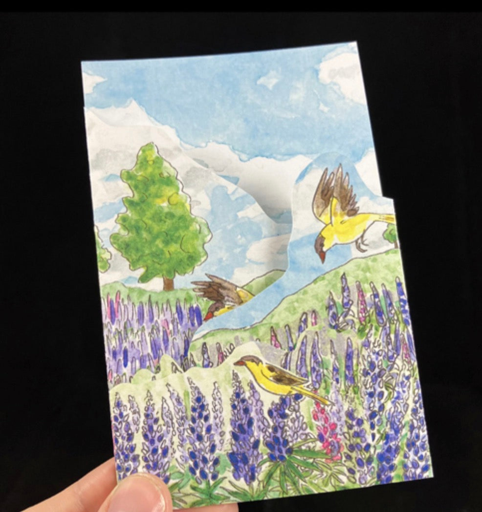 A tri-fold card featuring bright florals, created by Nova Scotia paper artist, Bard Hartman (Bard Bard Bard).