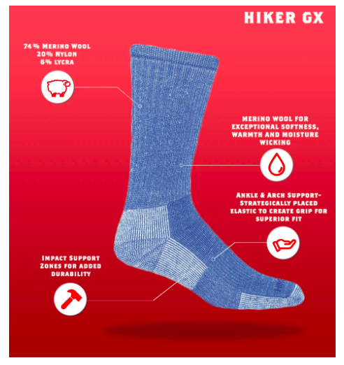 The Hiker GX is an all-season, multi-purpose merino hiking sock meant for outdoor activities. Arch support, half-cushion padding, and impact support zones ensure these hiking socks will outlast the competition. Made in Toronto.