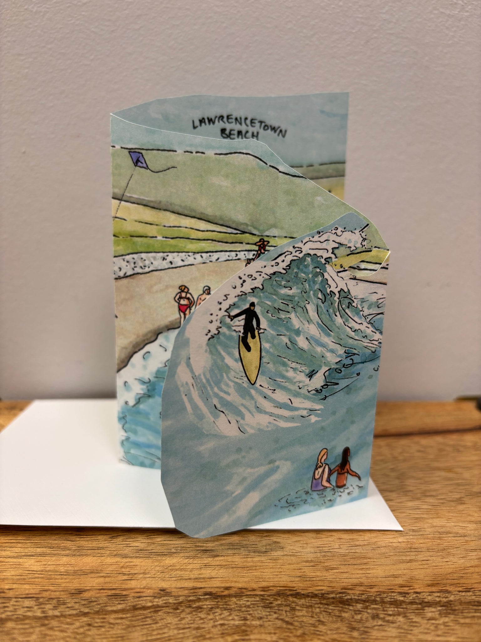 Tri-fold greeting card featuring a surfer on the waves at Lawrencetown Beach. Created by Nova Scotia paper artist, Brad Hartman (Bard Bard Bard). There is space on the back to write a short note.