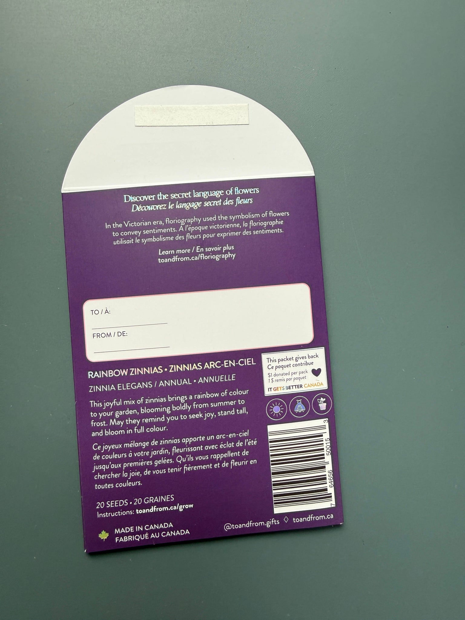 Seeds are sourced sustainably from partners in Canada, and all seeds are organic / non-GMO. Featuring bilingual packaging and holographic foil. RAINBOW ZINNIAS • ZINNIAS ARC-EN-CIEL Zinnia elegans / ANNUAL