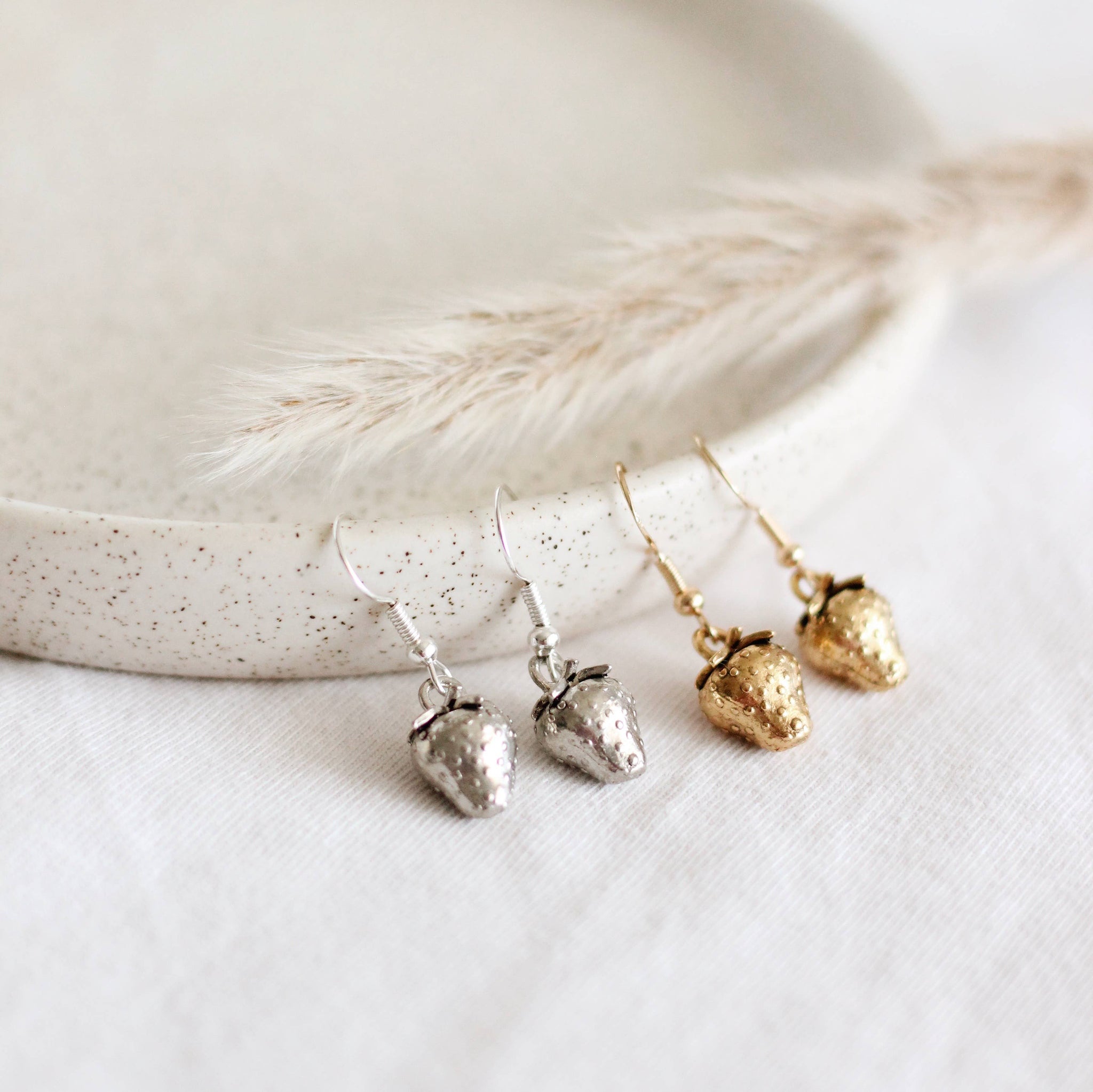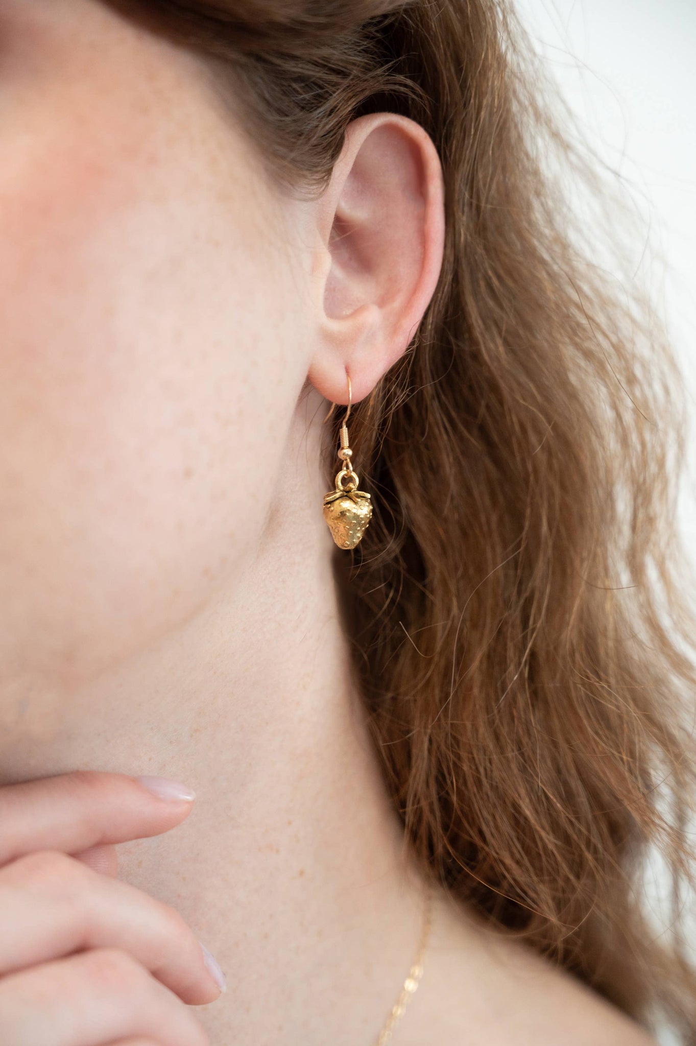 These quirky and playful earrings feature intricately detailed strawberry pendants, adding a touch of fun to any outfit.