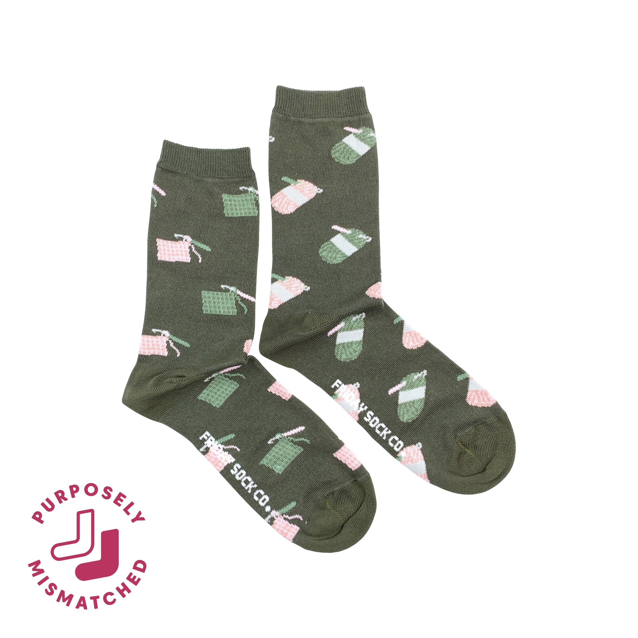 Women’s Crochet mismatched socks feature yarn and hook‑inspired graphics and soft certified cotton construction.